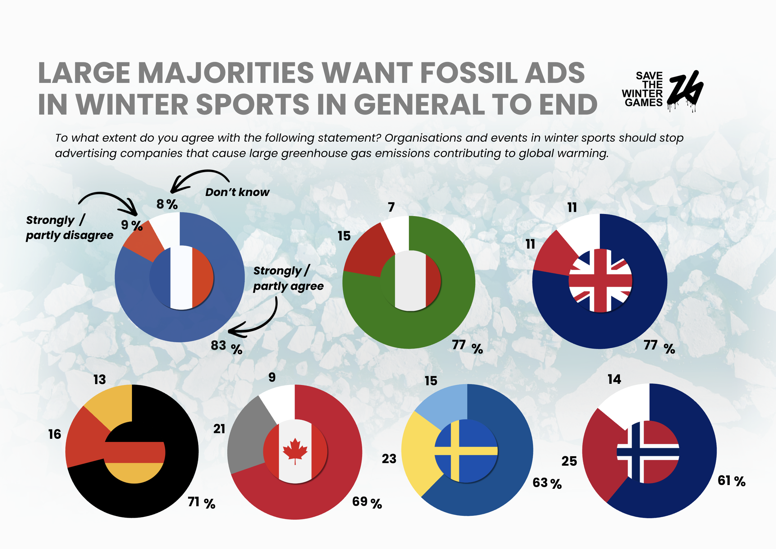 Support for ending fossil fuel advertising in winter sports is even higher, led by France (83%), Italy (77%) and the UK (77%).