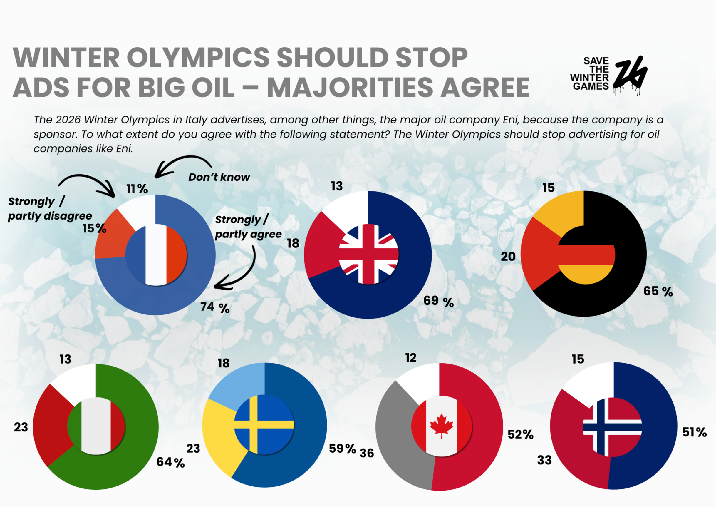 The polling was conducted by the agency Novus on behalf of the New Weather Institute (UK and Sweden), the Canadian Association of Physicians for the Environment (CAPE), and Klimakultur in Norway. Countries surveyed were Italy, France, Germany, Sweden, Norway, Canada and the UK. In every country polled except Norway – a major oil producer – a clear majority want the Olympics and winter sports in general to stop advertising high-carbon companies. The findings are particularly resonant given that the Milano Cortina 2026 Winter Olympics are sponsored by the Italian oil major Eni.