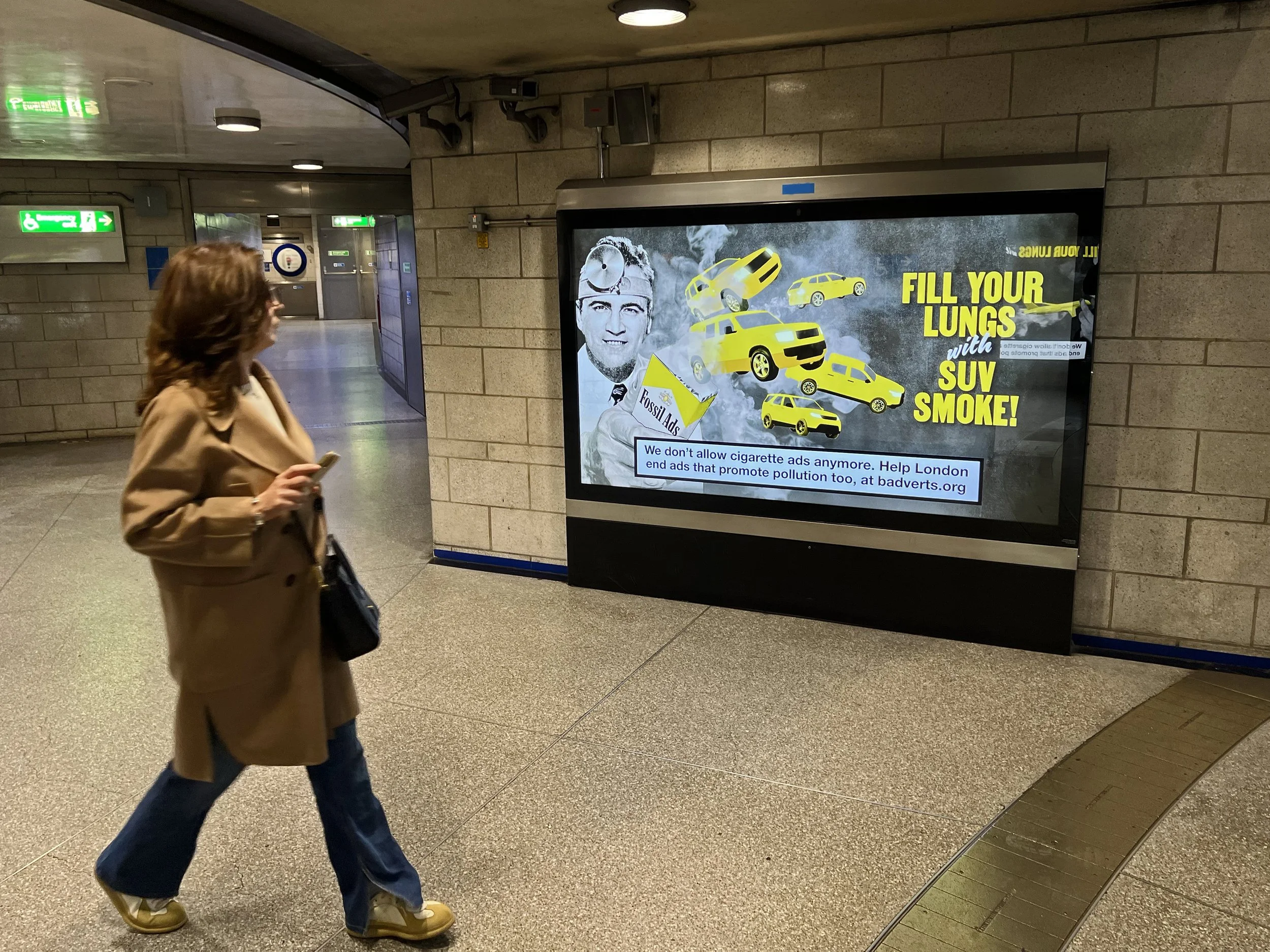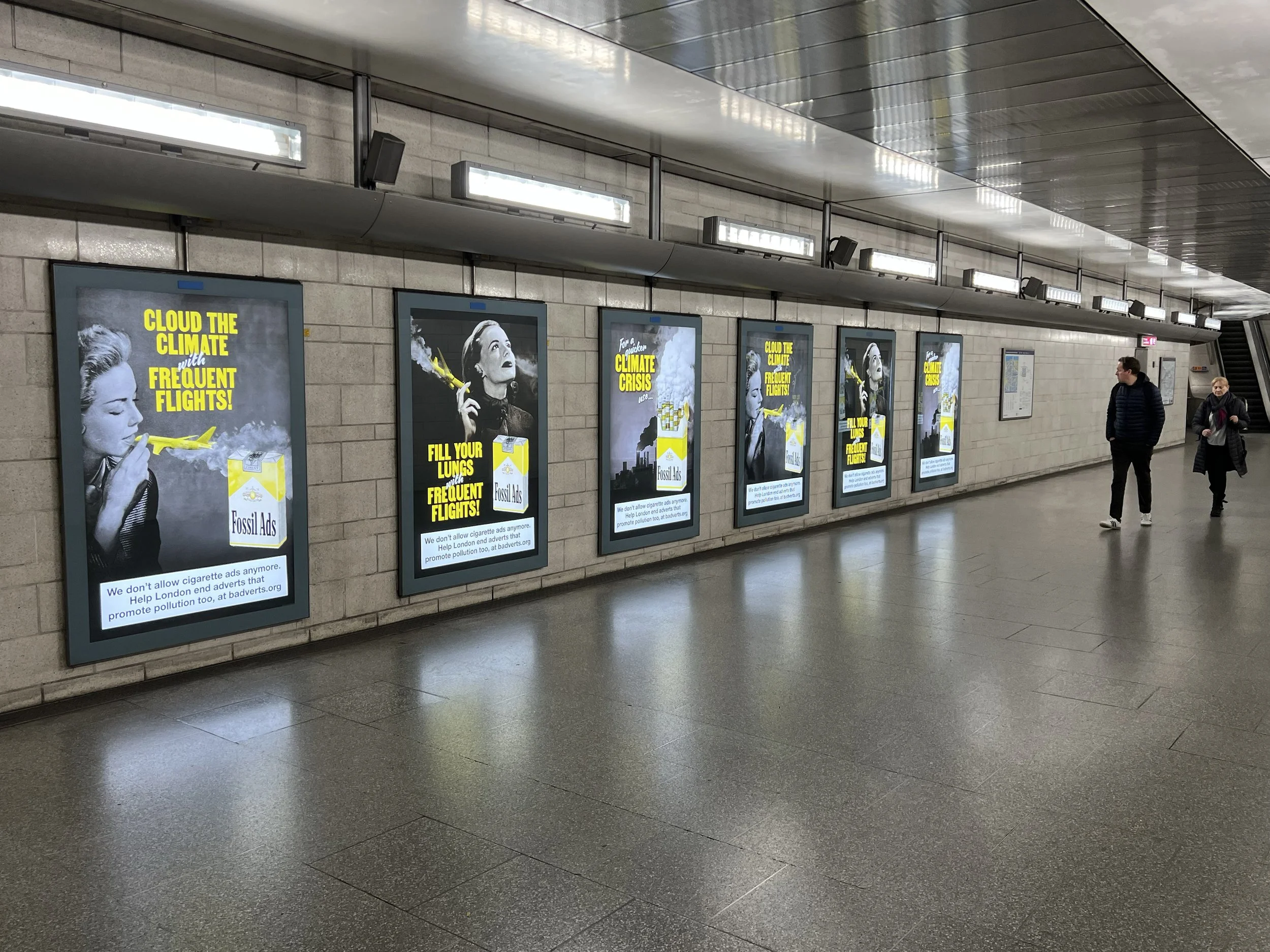 This month Badvertising rolled out its new ‘official’ campaign across Southwark tube station. Posters took over station and ticket barrier ad space, calling on London to end adverts that promote pollution and follow the example of tobacco ad bans in the past. Artwork created by Matt Bonner, highlighting the massive climate and health impacts of adverts for fossil fuels, frequent flights and SUVs.